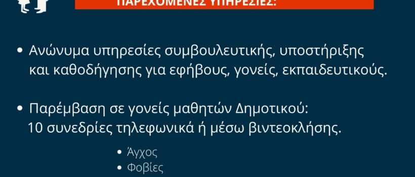 Η πενταψήφια δημόσια και δωρεάν Τηλεφωνική Γραμμή Ψυχοκοινωνικής Υποστήριξης 10306 τέθηκε σε λειτουργία το Σάββατο 4 Απριλίου 2020 με αρχικό σκοπό την εύκολη πρόσβαση των πολιτών που κατοικούν όλη την επικράτεια της Ελλάδας σε Ειδικούς Ψυχικής Υγείας και την τηλεφωνική υποστήριξή τους, για τις πολυδιάστατες επιπτώσεις της πανδημίας του Covid-19, κατά την περίοδο της πρώτης […]