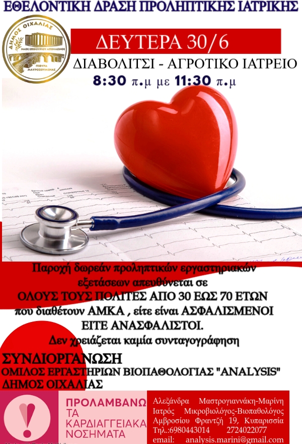 Σε δωρεάν ιατρικές εξετάσεις θα υποβληθούν προληπτικά, τη Δευτέρα 30 Ιουνίου 2025 από τις 8:30 έως τις 11:30 το πρωί, στο Αγροτικό Ιατρείο του Διαβολιτσίου, όσοι πολίτες επιθυμούν με την προϋπόθεση πως έχουν ΑΜΚΑ. Οι εξετάσεις αφορούν σε άτομα ηλικίας από 30 έως 70 ετών και η δράση υλοποιείται από τον Όμιλο Εργαστηρίων Βιοπαθολογίας “ANALYSIS” και το Δήμο Οιχαλίας.