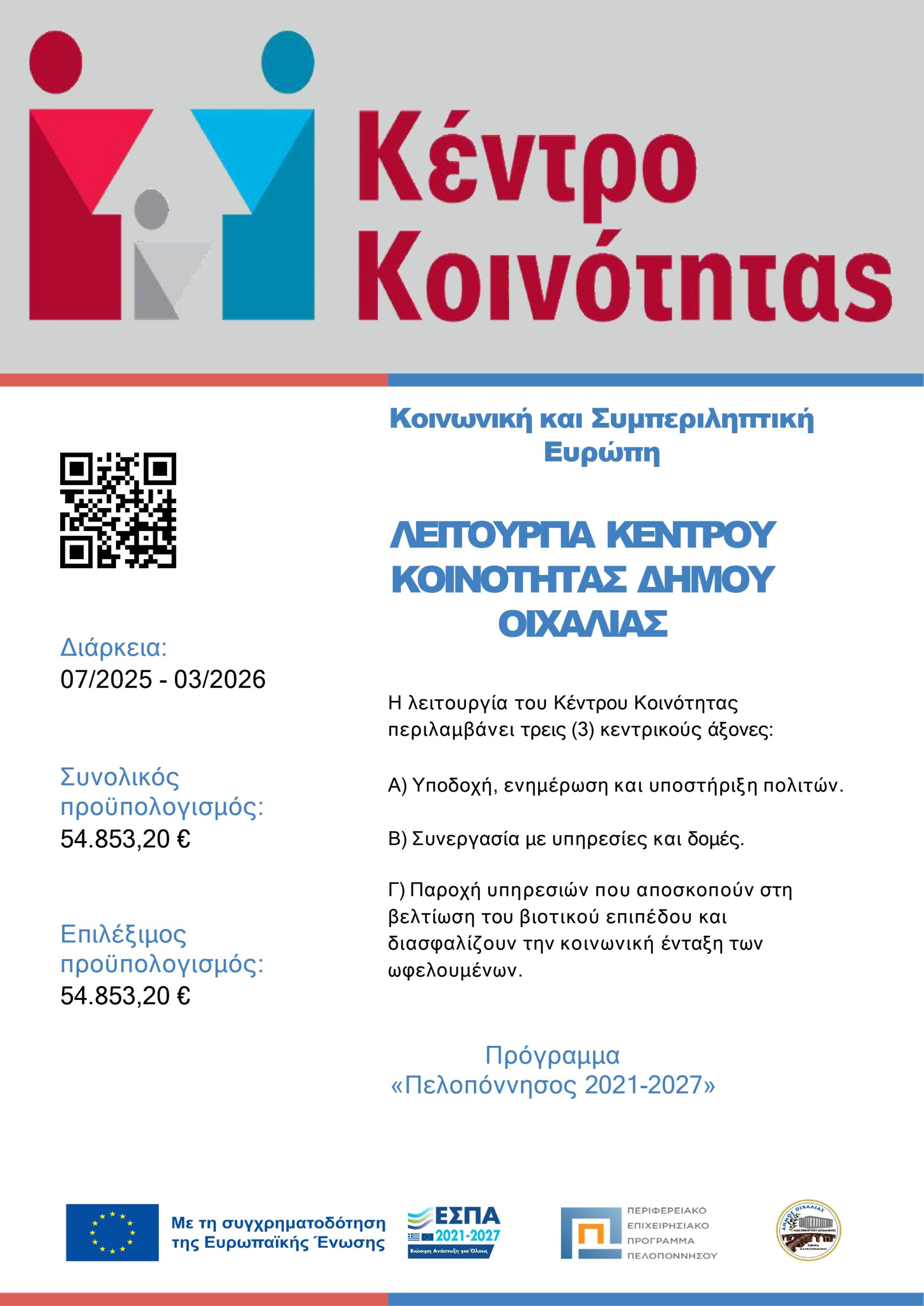 Το Κέντρο Κοινότητας λειτουργεί σε μόνιμη, καθημερινή βάση, ως τοπικός κόμβος εξυπηρέτησης και κοινωνικής στήριξης για όλους τους κατοίκους του Δήμου, παρέχοντας υπηρεσίες κοινωνικής πρόνοιας, υποστήριξης ευάλωτων ομάδων, ενημέρωσης για προγράμματα και διασύνδεσης με άλλες δομές.