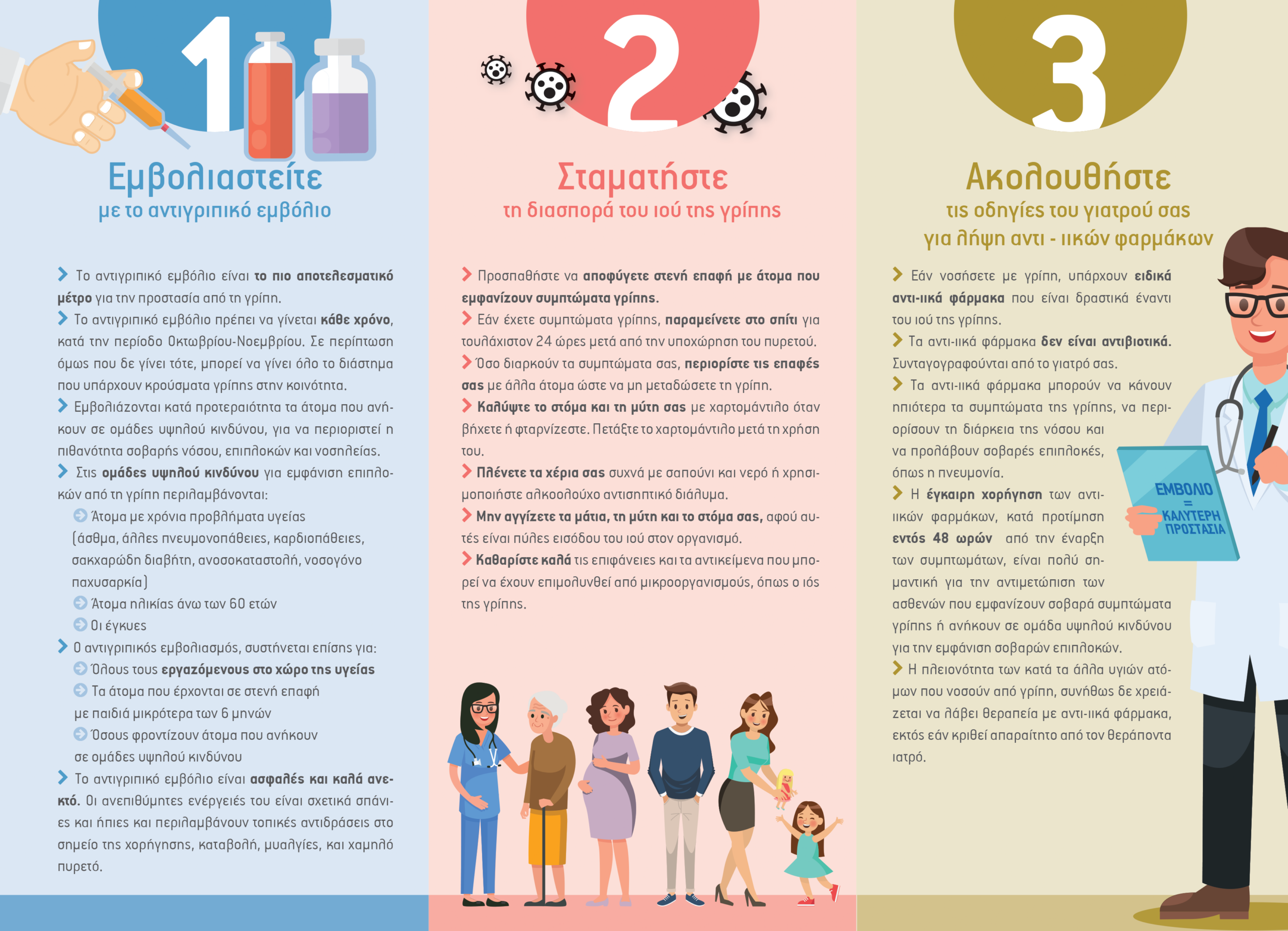 • Εμβολιασμό κατά της γρίπης, χωρίς καθυστέρηση, κυρίως στις ομάδες υψηλού κινδύνου. Ο εμβολιασμός παραμένει το καλύτερο μέτρο πρόληψης, καθώς παρέχει σημαντική προστασία έναντι της σοβαρής νόσησης και του θανάτου από γρίπη.