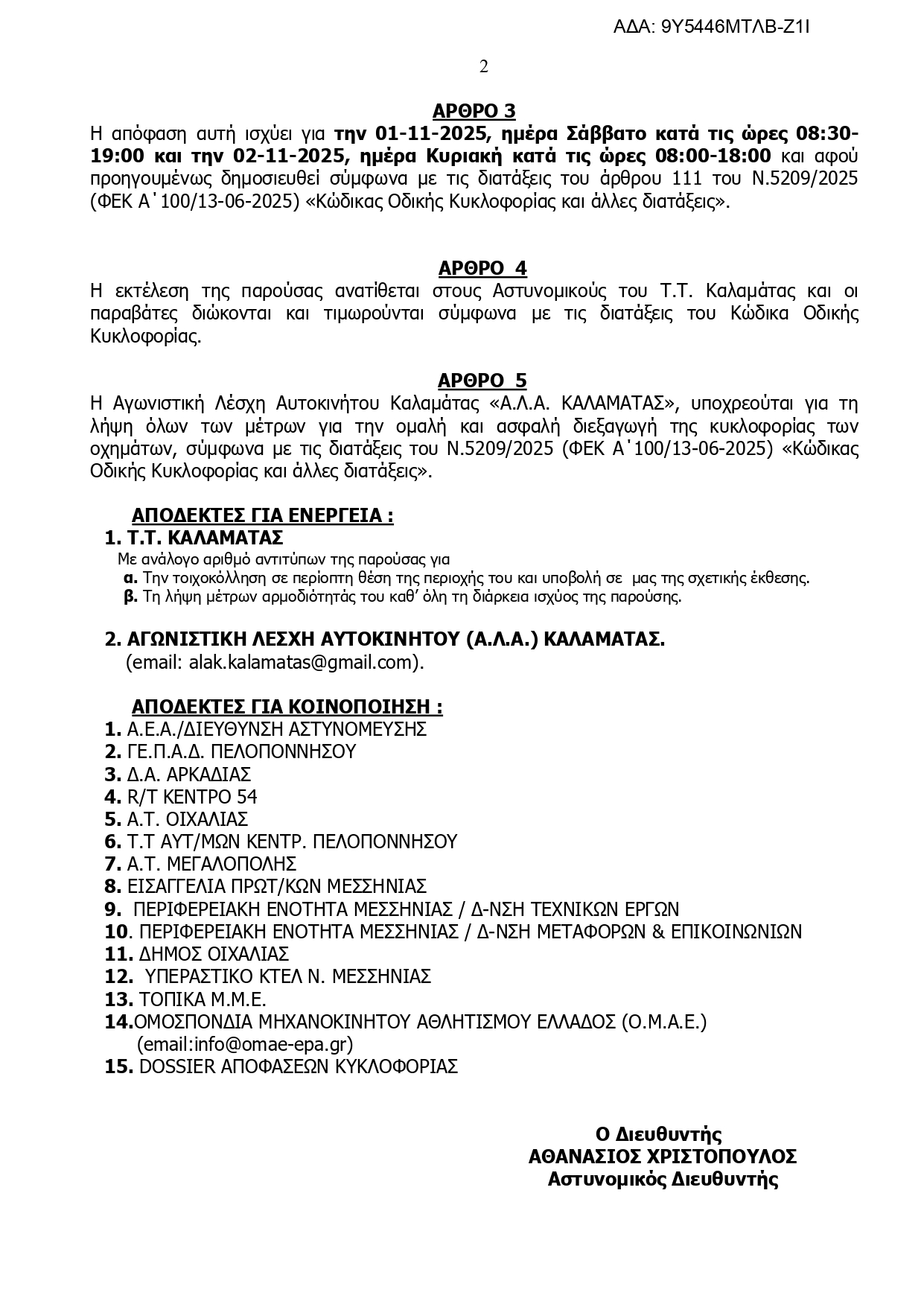 • 15:00: Απονομή επάθλων στην Κεντρική Πλατεία Μελιγαλά