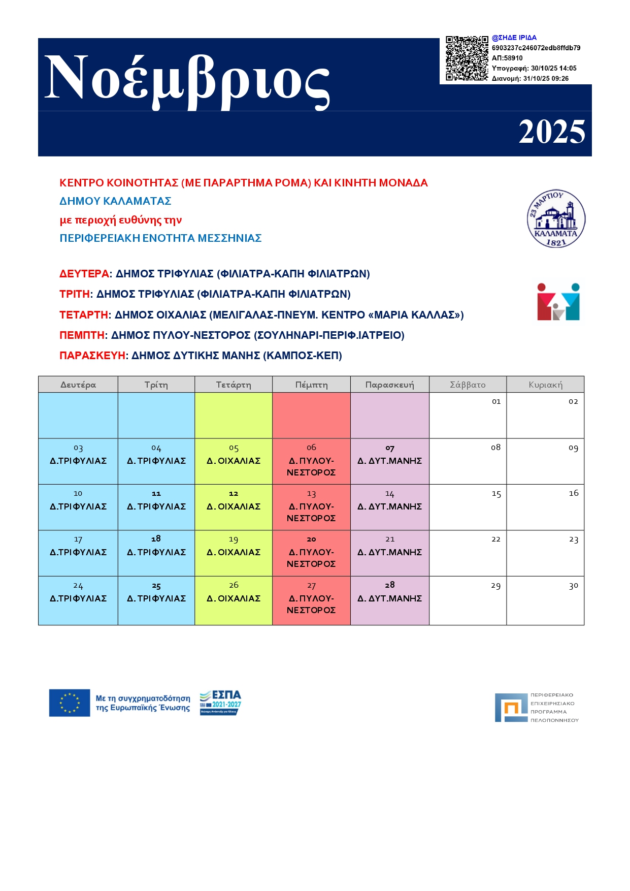 Τέσσερις επισκέψεις θα πραγματοποιήσει κατά τη διάρκεια του Νοεμβρίου στο Μελιγαλά, η κινητή μονάδα του Κέντρου Κοινότητας Μεσσηνίας.