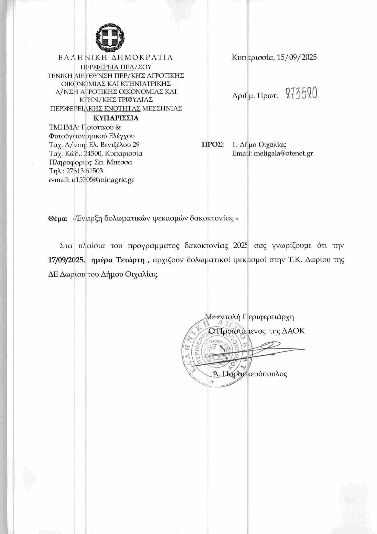 Ξεκινούν την Τετάρτη 17 Σεπτεμβρίου 2015 οι δολωματικοί ψεκασμοί στο Δώριο